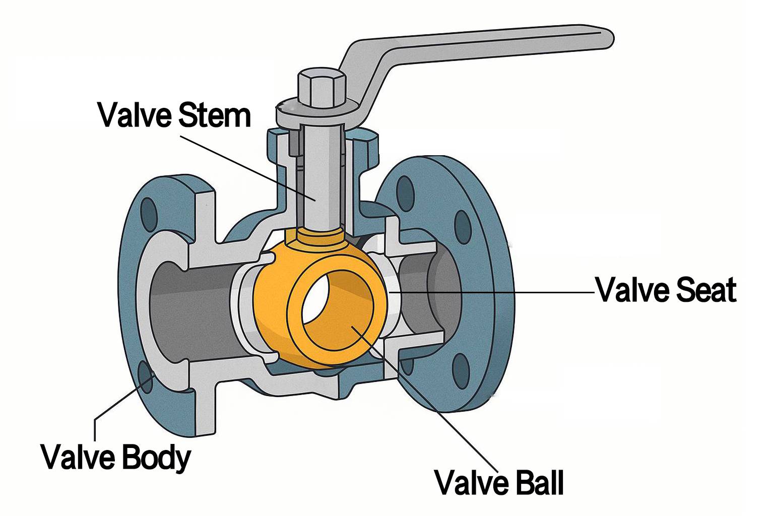 O princípio de trabalho de uma válvula de esfera está intimamente ligado à sua estrutura. Os principais componentes de uma válvula de esfera incluem: