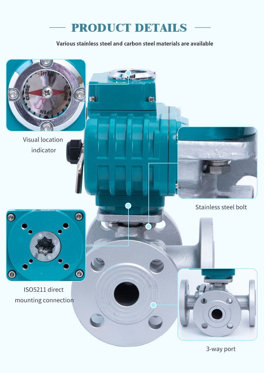 'Electric 3 Way Flangedd Ball Valve ' significa uma válvula de esfera flangeada de três vias com um atuador motorizado elétrico. Eles geralmente são usados como uma válvula desviadora para controlar a água, o ar, o óleo e outros meios compatíveis com os materiais de construção. Através de girar 90 ° graus (trimestre) para alterar a direção do fluxo. Enquanto eles geralmente operam mais lentamente do que as válvulas com um atuador pneumático, geralmente é o caso de a eletricidade estar disponível e o ar comprimido não.