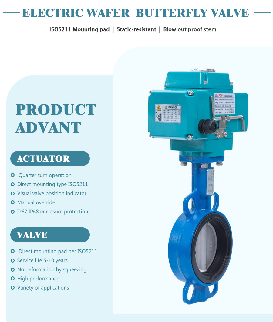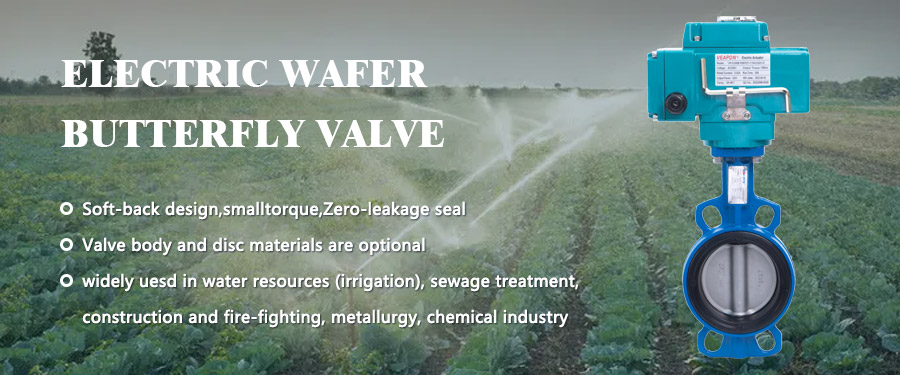 | 'Válvula de borboleta elétrica de wafer ' significa uma válvula de borboleta com sentado macio com um atuador elétrico. É usado para o controle on-off da água e outras mídias compatíveis com os materiais de construção. Eles giram 90 graus (quarto de volta) de totalmente aberto para totalmente fechado. Enquanto eles geralmente operam mais lentamente do que as válvulas com um atuador pneumático, geralmente é o caso de a eletricidade estar disponível e o ar comprimido não. Sanduíche de válvula de estilos de wafer Montagens entre clientes fornecidos com flanges de tubo ANSI/ ASME Classe 125/150. A unidade padrão é de potência e poder para fechar, permanece na última posição conhecida com perda de energia. Após o recebimento de um sinal de tensão contínua, o motor é executado e por meio de uma transmissão de engrenagem de auto-bloqueio de metal gira o disco de um quarto de volta. O motor é interrompido automaticamente por cames internos que atingem interruptores de limite nas posições abertas e fechadas. Ao receber um sinal contínuo de reversão, o motor gira na direção oposta, revertendo a posição da válvula.