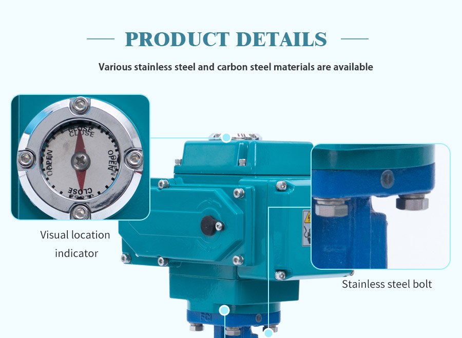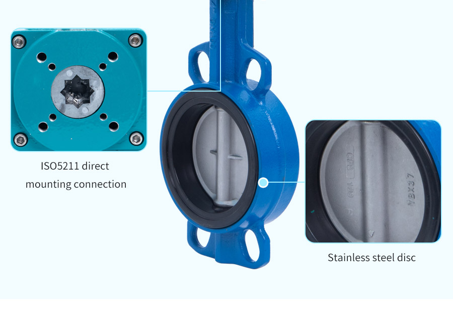 A válvula é montada direta ao atuador usando o bloco de montagem ISO5211 do padrão internacional. O design de motor/carcaça integral exclusivo e acidentado oferece maior torque em um pacote muito pequeno. Sede da linha de ondas especiais e forma de disco, reduz o torque necessário e estende a vida útil da válvula. O disco metálico usinado por precisão com a construção de haste de duas peças (eixo) aumenta a capacidade de fluxo da válvula e reduz a turbulência. O caule utiliza rolamentos de PTFE/grafite com vedações de anel V, impedindo o vazamento.