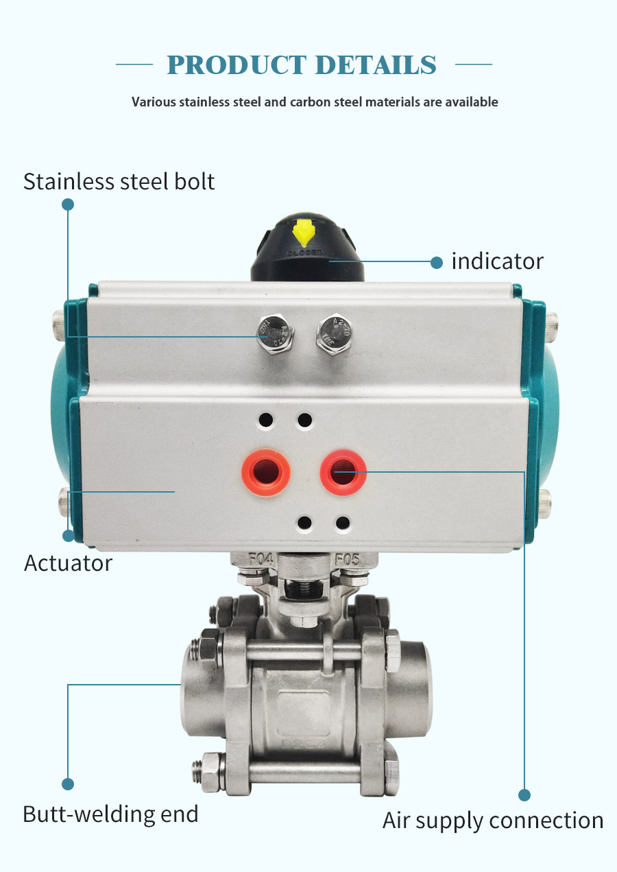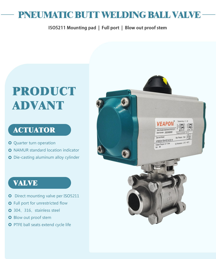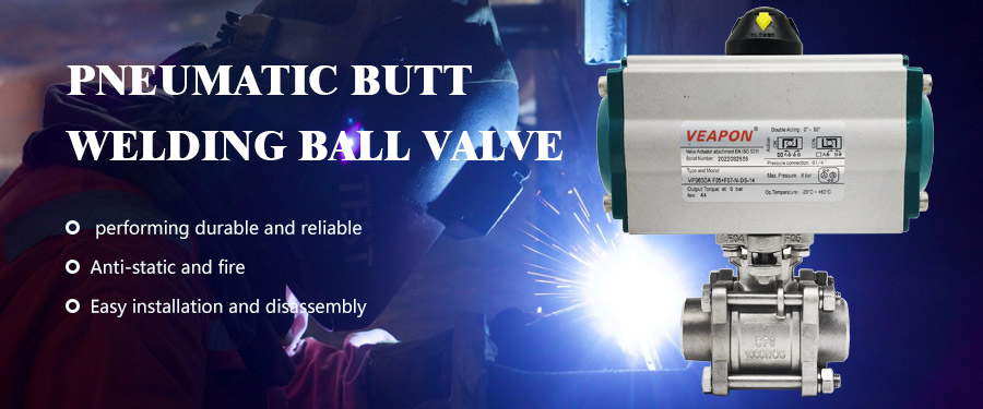 Pneumatic butt welding ball valve with integrated structure can be drived by air cylinder (double acting or single acting with spring return), with the characters of small volume, high flow capacity, high regulation precision, good sealing, and light weight, etc. The valve is widely used in food, environmental protection, light industry, petroleum, paper, chemicals, teaching and research equipment, and electric power industries of industrial automation control systems.